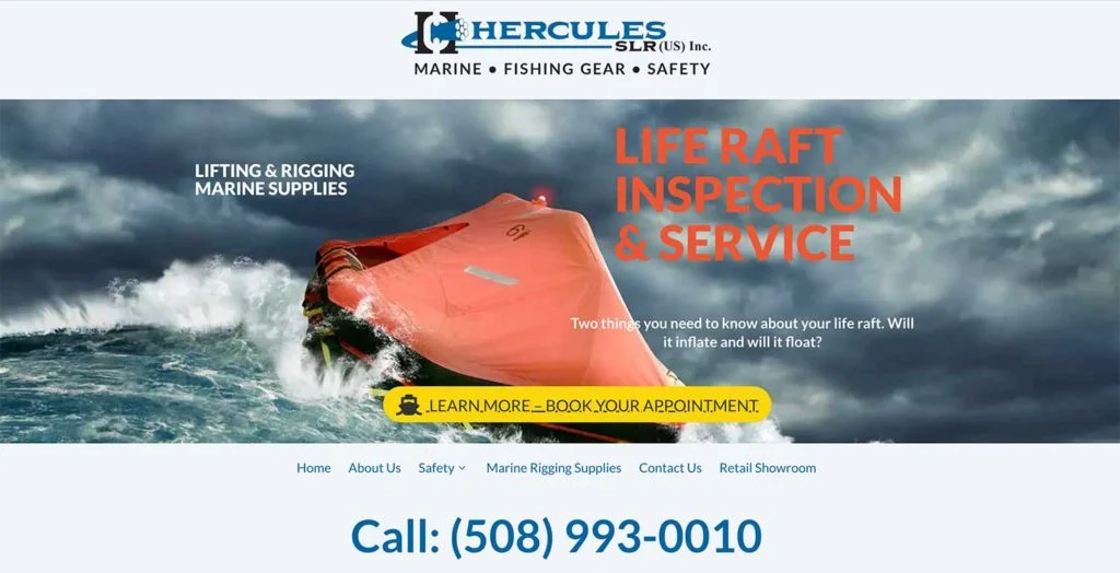 Comparing Hercules's websites graphics above one can easily see that the new site has ten times more content and is rich in graphics that are "designed in" to engage a potential visitor. To enhance the user experience we have broken down the services that Hercules offers. Lifting and rigging, Survival training, Products, and Life raft sections are clearly defined.