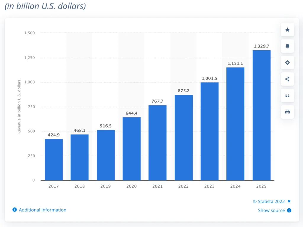 Revenue from retail e-commerce in the United States was estimated at roughly 768 billion U.S. dollars in 2021. The Statista Digital Market Outlook forecasts that 2025 online shopping revenue in the U.S. will exceed 1.3 trillion dollars.